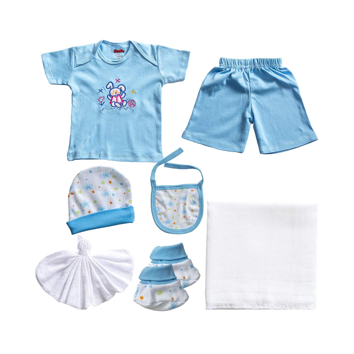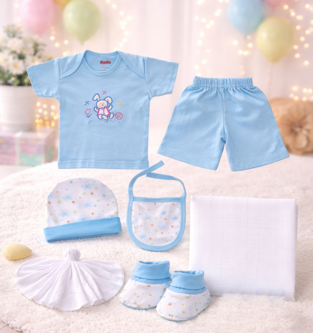 Gift Set II- Blue (7 Pcs) with Shirt, Short, Hat, Bib, Booties, Wash Cloth and Baby Towel, 100% Combed Cotton